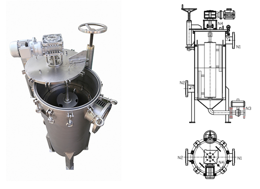 运转方式:由减速马达驱动紧贴于滤网表面的刮刀旋转,刮除滤网表面杂质,杂质离开滤网表面随下行的液体落入过滤器底部的杂质收集腔内,排污阀按设定程序打开,将杂质排出。